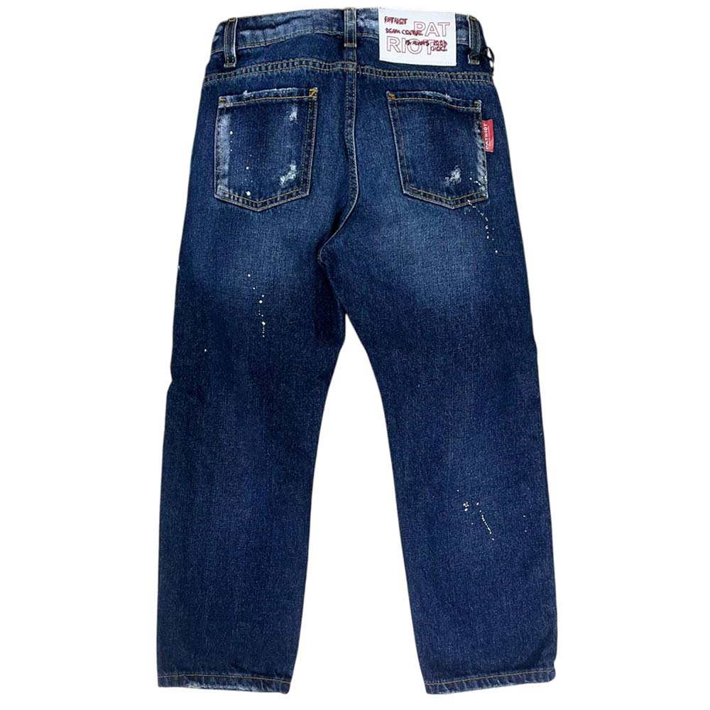 Jeans Loose fit realizzati in denim blu con sfumature, macchie di colore e rotture. Modello cinque tasche. Chiusura frontale con bottone e zip, vita regolabile grazie ad elastico interno con bottoni, passanti per cintura e label logo sulla parte posteriore.