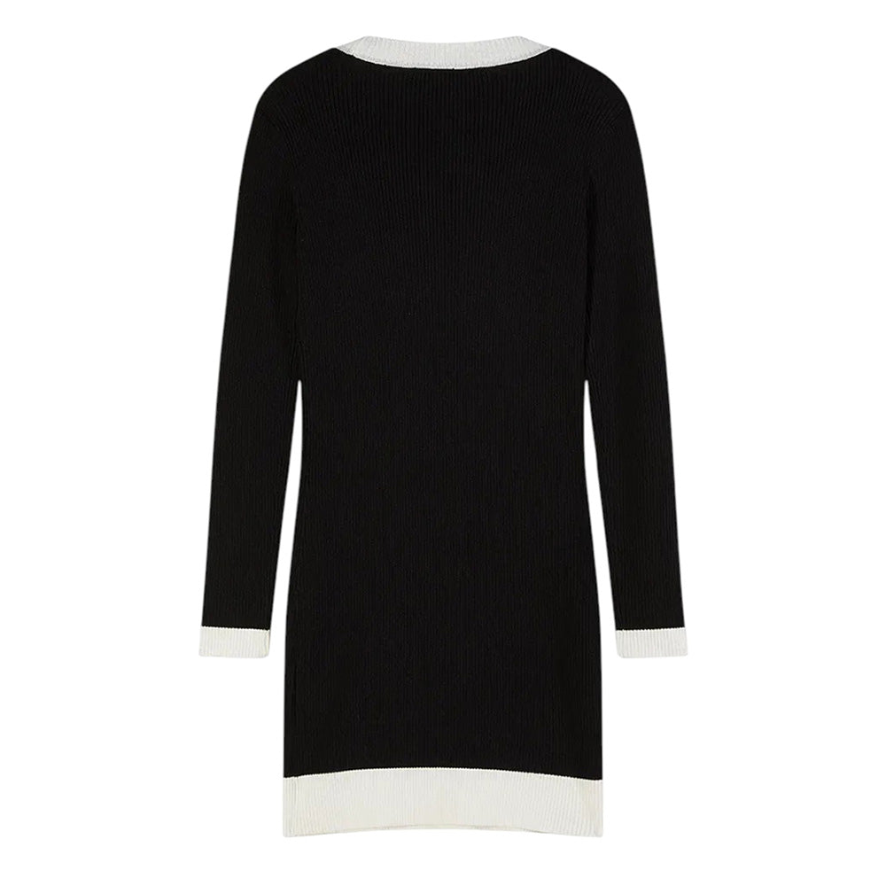 Abito realizzato in maglia a coste di misto viscosa, caratterizzato collo tondo, maniche lunghe, orlo dritto e finiture a contrasto. È decorata con patch logo applicata sul davanti.