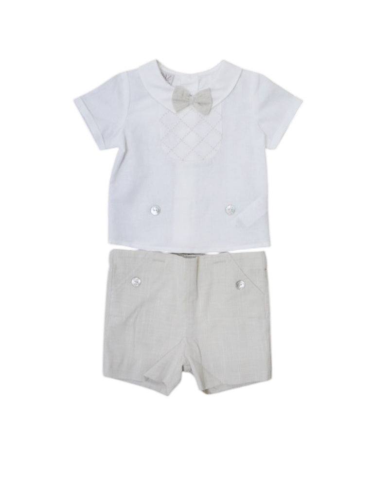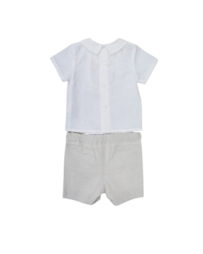 Il completo Cerimonia Paz Rodriguez è composto da una camicia in lino dal classico collo a punta e un elegante papillon con fantasia geometrica a contrasto sul davanti. I bottoncini in madreperla aggiungono un tocco di raffinatezza. Il pantaloncino corto, legato alla camicia, completa questo look sofisticato e di tendenza. Perfetto per ogni occasione speciale.