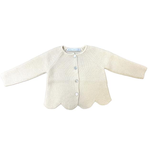 Cardigan sweater, round neck, buttons on the front, wavy hem.