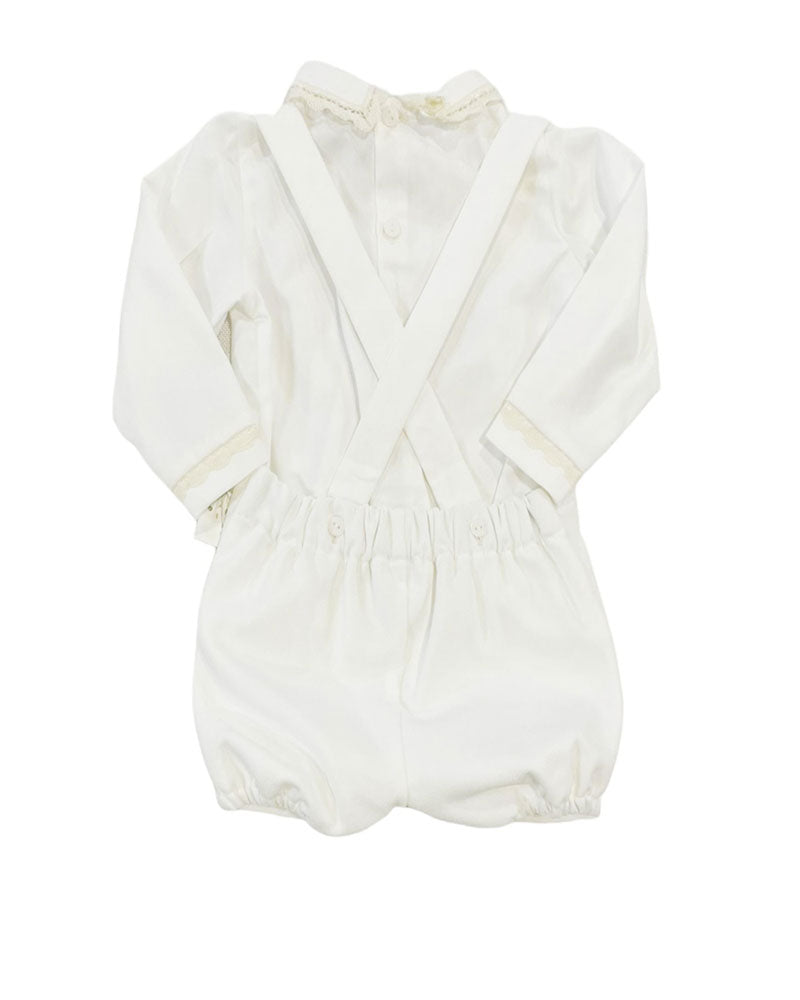 con camicina maniche lunghe e colletto in pizzo, pantaloncino corto con bretelle e dettagli in pizzo