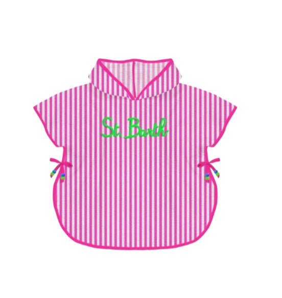 Girls' poncho with hood in terry fabric, striped pattern, contrasting St.Barth logo embroidery on the front.