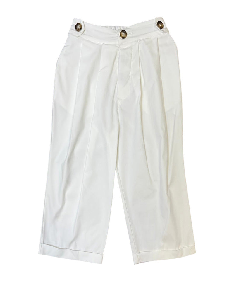 Pantaloni con pinces realizzati in popeline di cotone da bambina, presentano vita elasticizzata, chiusura frontale con bottoni, due tasche laterali e risvolto alla caviglia.
