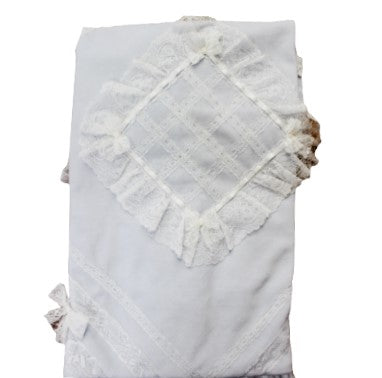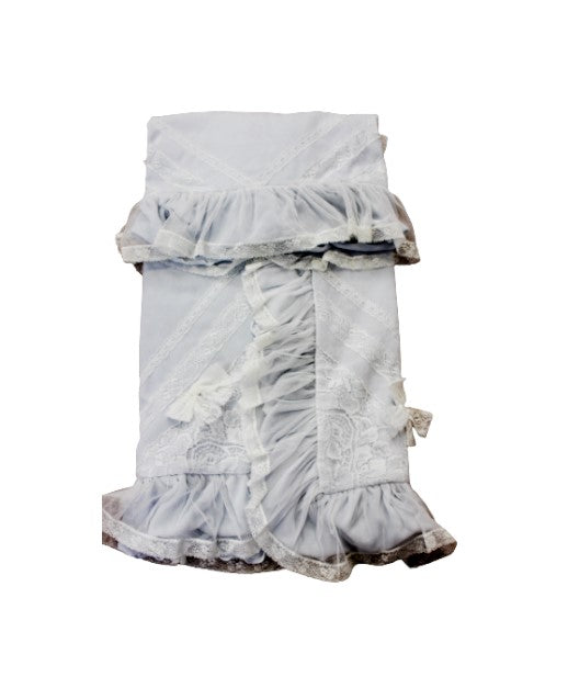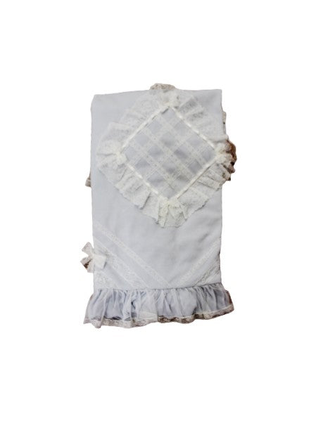 Make your baby look even more elegant with this light blue chenille blanket from Aletta. The model features a beautiful diamond pattern in the center lace and a lovely ruffled border. Perfect for keeping your little one warm while adding a touch of style to their look.