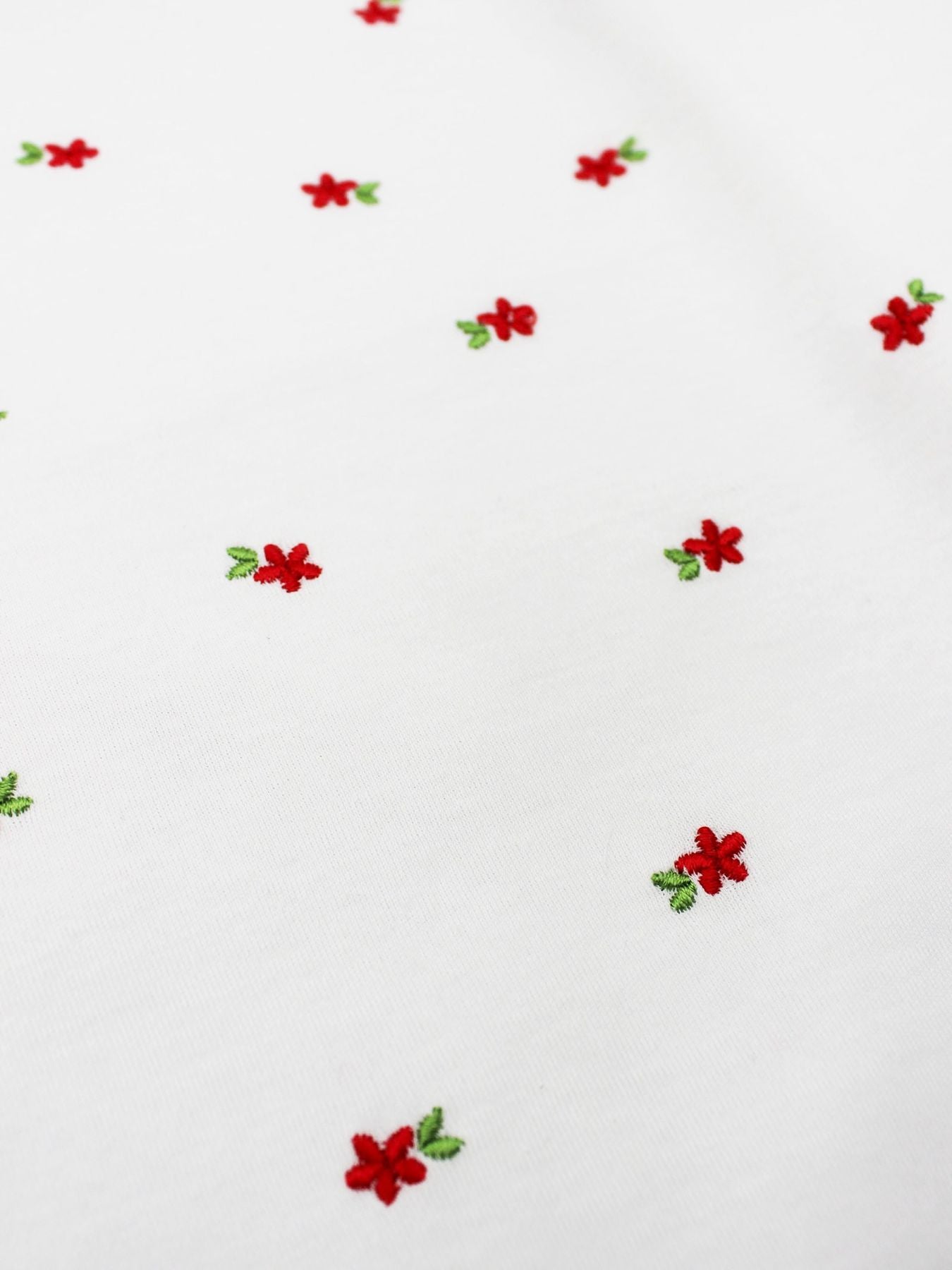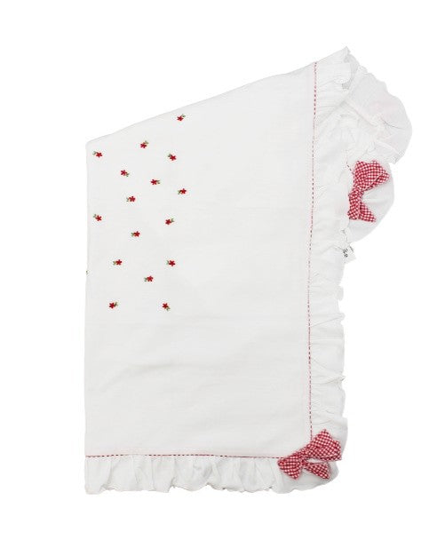 Aletta Newborn Blanket in white cotton with red details. Model with ruffled edge with red bows at the corners and central embroidered red flowers.