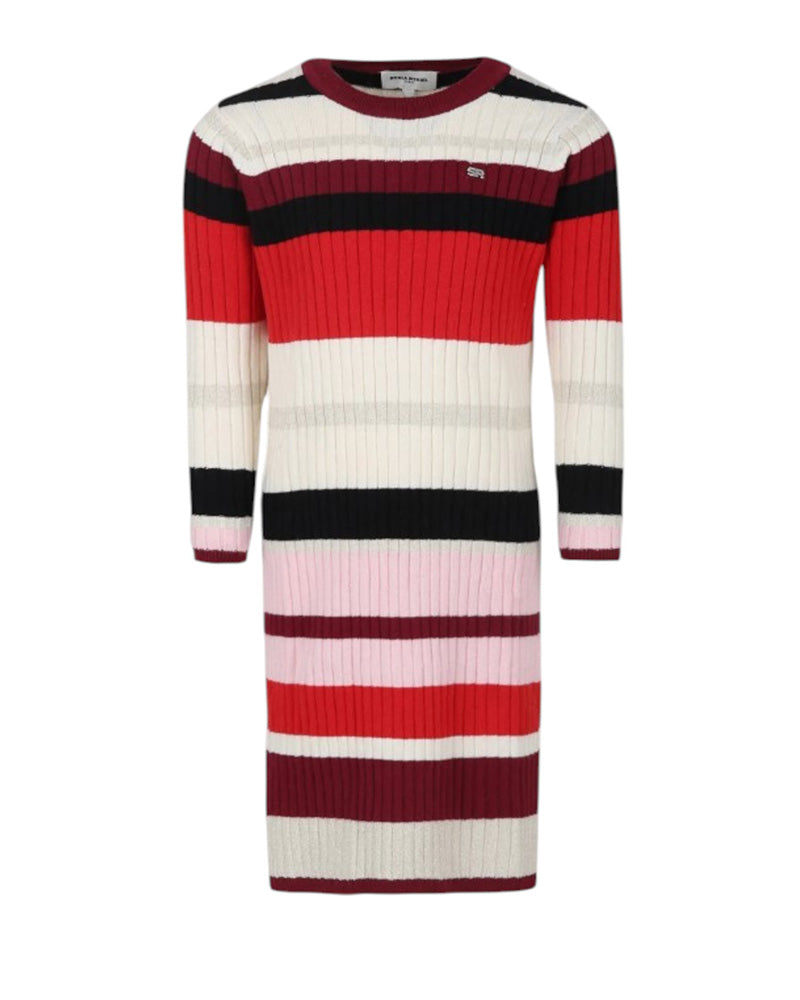 Abito midi a coste da bambina realizzato in misto cotone. Presenta collo tondo, fantasia a righe multicolor con dettagli lurex all-over, maniche lunghe e orlo dritto.