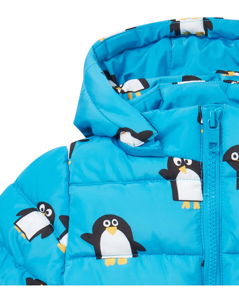 Quilted jacket with removable hood for newborns, front zip fastening, side American pockets, all-over pattern.