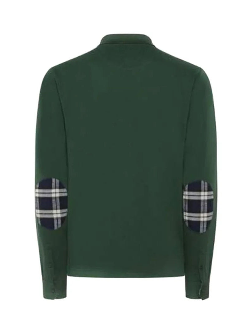 Polo verde da bambino realizzata in piquet di cotone. Presenta colletto a punta, chiusura frontale con bottoncini, maniche lunghe e orlo dritto. È decorata con logo ricamato sul petto e con toppe in fantasia sui gomiti.