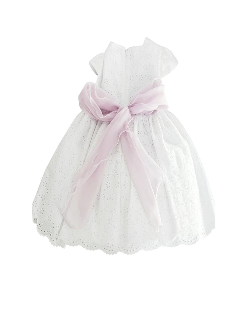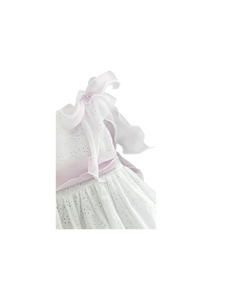 Unisce eleganza e audacia con la Vestina Cerimonia ve7424 In Sangallo di Teto e Tatta! La manica ad aletta, il fiocco e la cintura in organza creano un look unico e il cappello abbinato completa il tutto. Risalta il colore a contrasto e preparati a stupire tutti!