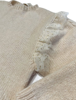 Long-sleeved wool and cashmere dress, tulle edges on the shoulder straps, back fastening with buttons.