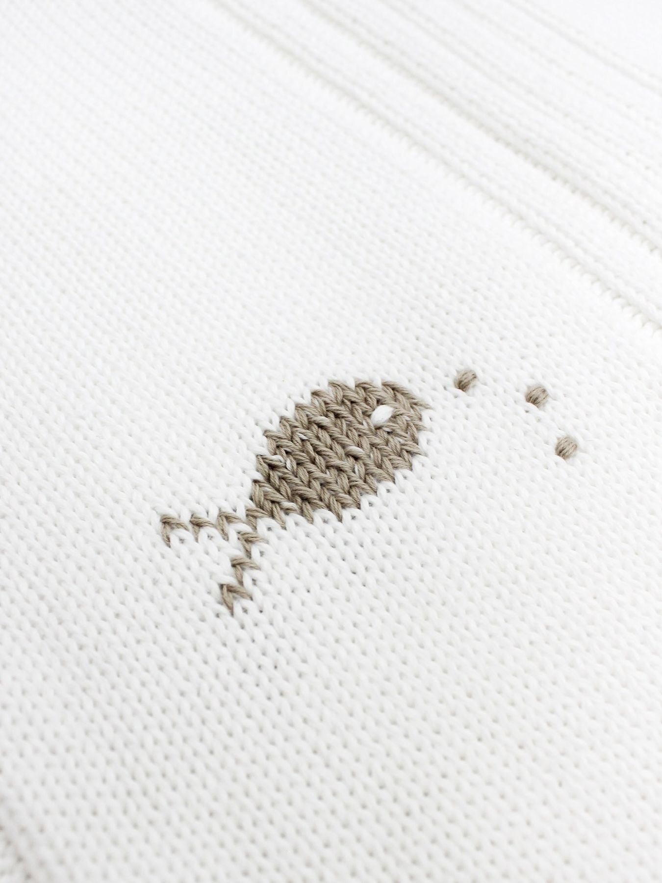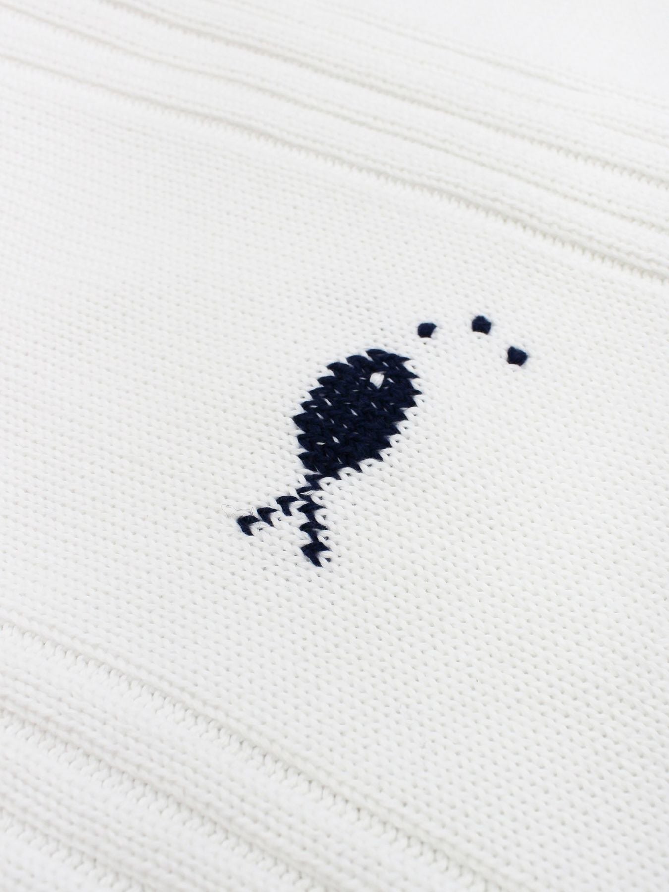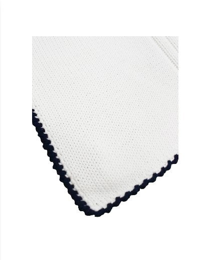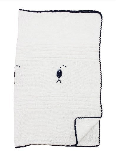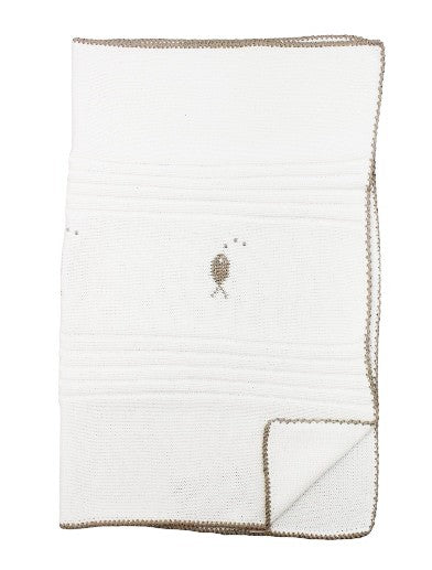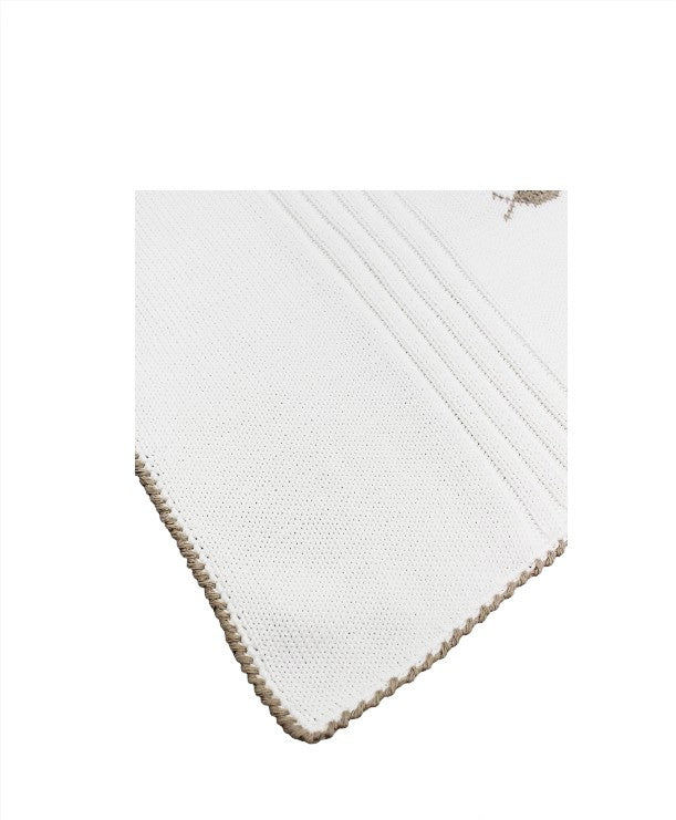 Copertina Little Bear neonato in filo bianco con dettagli colorati. Modello con bordura a contrasto.