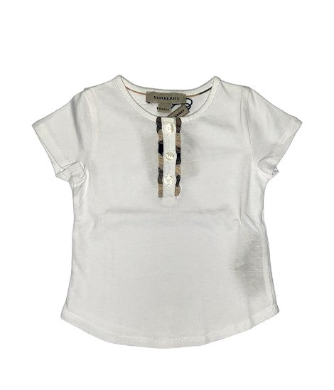 T-shirt girocollo con bottoncini di chiusura, ruches in check classico sul davanti.