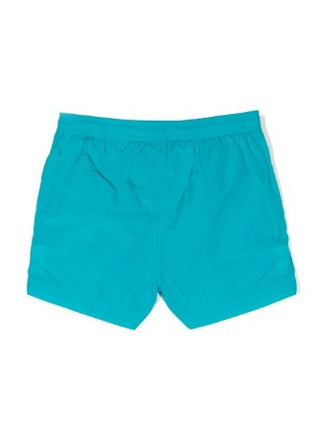 Costume bambino modello boxer di media lunghezza. Vita elasticizzata con coulisse interna, tasche laterali america. Patch logo applicato sul davanti.