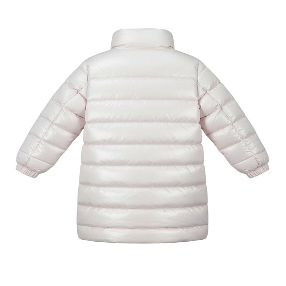 Giubbino imbottito lungo realizzato in nylon, con dettaglio in eco pelliccia sulla parte anteriore. Presenta design trapuntato sulle maniche e sul retro, colletto rotondo, maniche lunghe con polsi elasticizzati, chiusura frontale con zip e orlo dritto. È decorato con applicazione fiocco sul davanti.