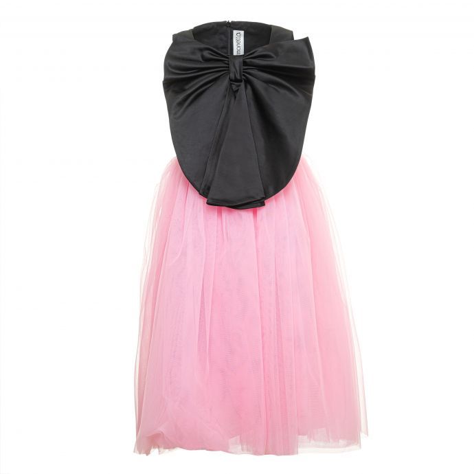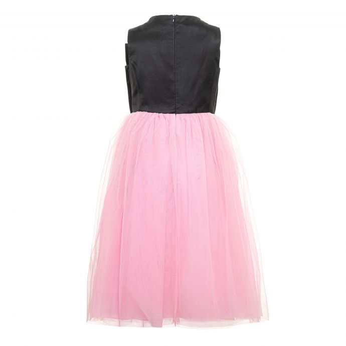 Abito lungo girocollo, senza maniche, gonna in tulle, fiocco applicato.