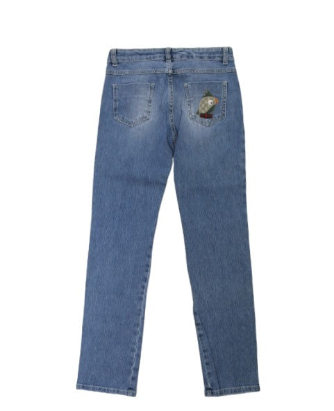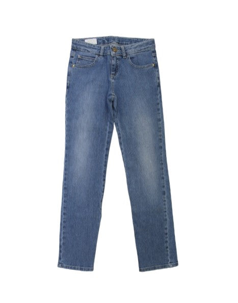 Jeans in denim, modello cinque tasche. Chiusura frontale con bottone e zip. Applicazione logata sul taschino posteriore.
