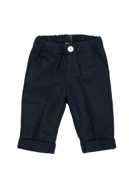Pantalone in panno, tasca america, elastico in vita, bottone applicato.