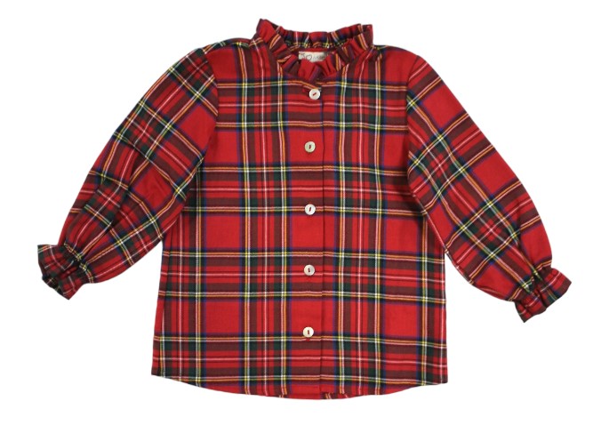 Camicia scozzese, bottoncini di chiusura, colletto e polsini con arricciatura.