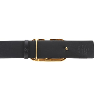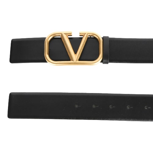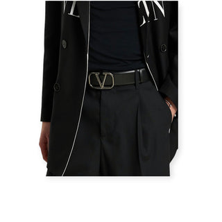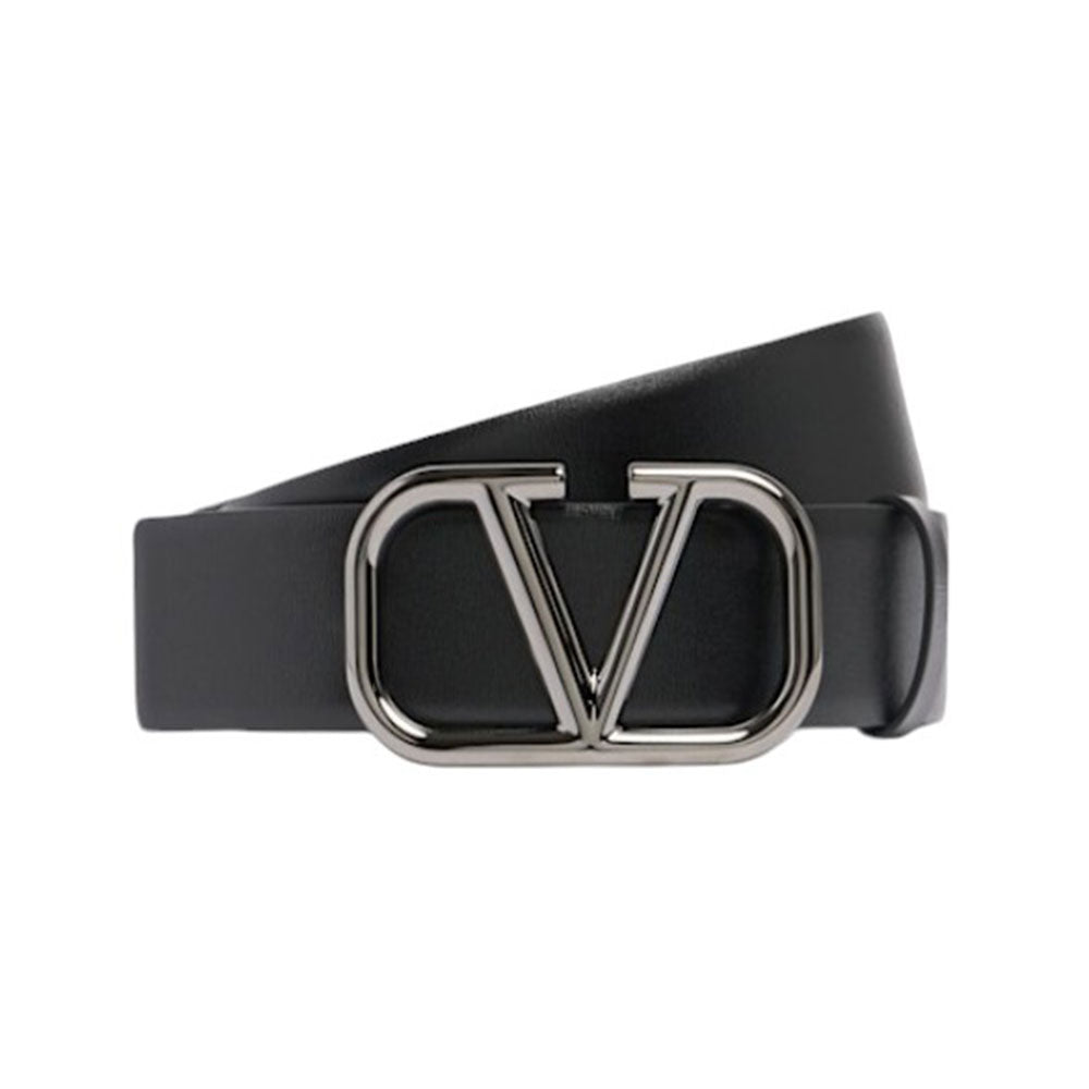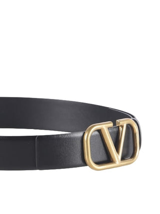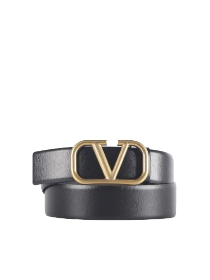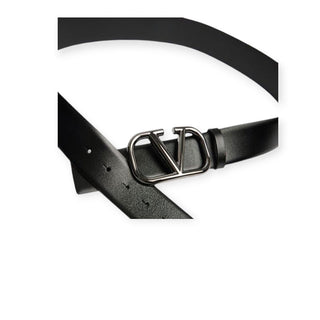 Cintura Valentino Garavani VLogo in pelle nera. Modello con fibbia a V metallica color oro removibile. Spessore 4cm