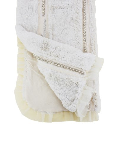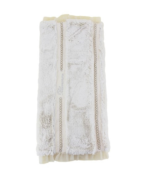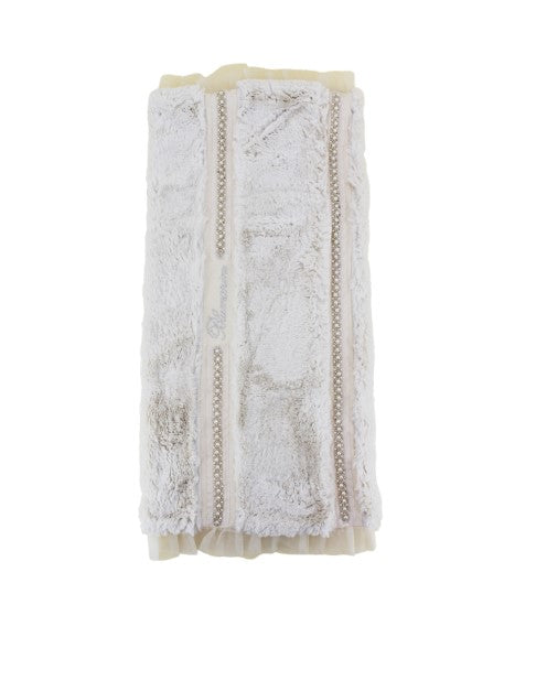 Modello con logo del brand al centro , fasce di perle e bordo con rouces in velo.