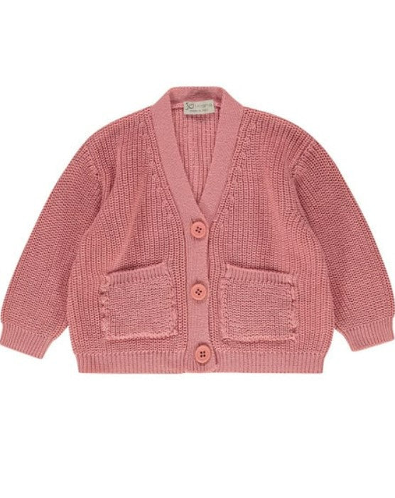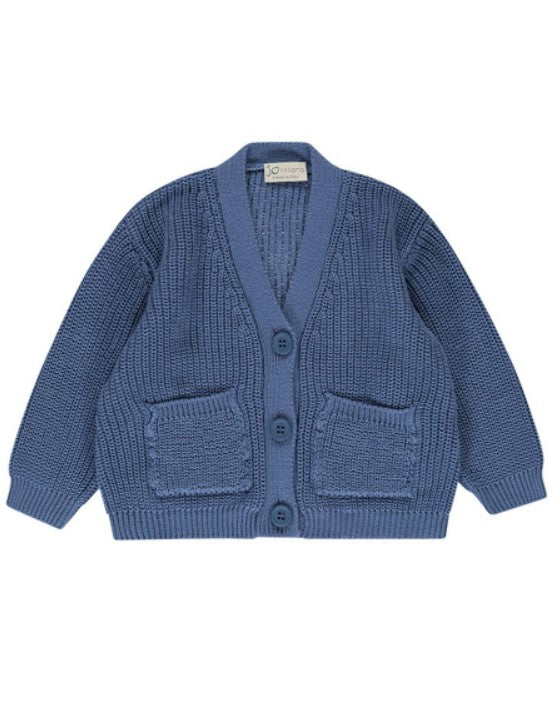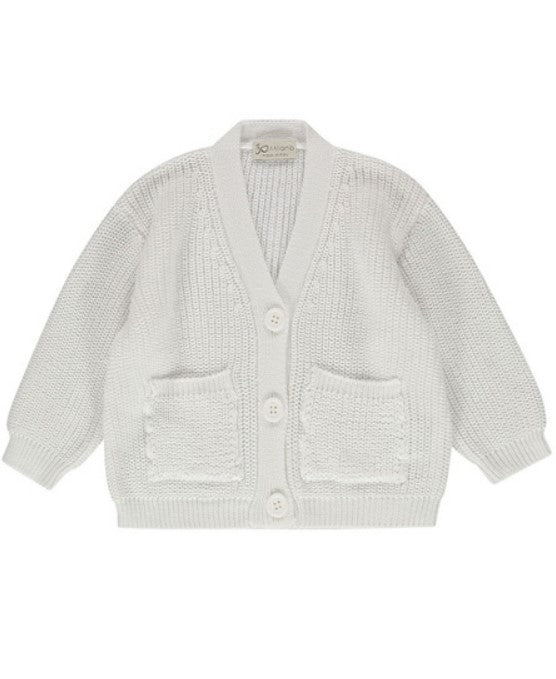 Maglia cardigan in filo di cotone con scollo a V, chiusura anteriore con bottoni, tasche applicate sul davanti.