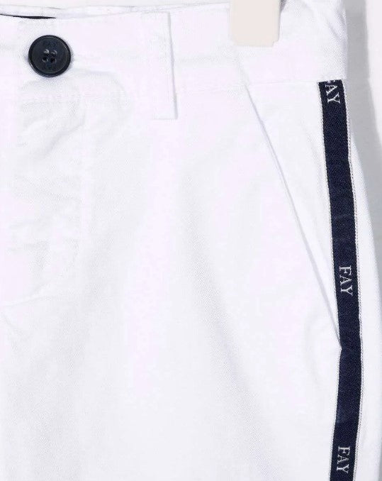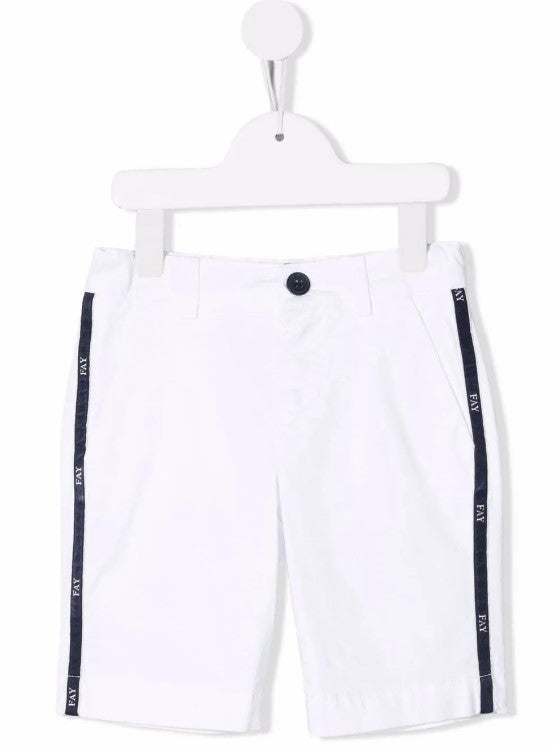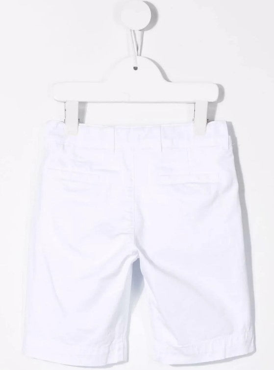 Bermuda ragazzo in cotone, tasca america, chiusura anteriore con zip e bottone, bande laterali con logo in contrasto, due tasche a filetto sul retro.