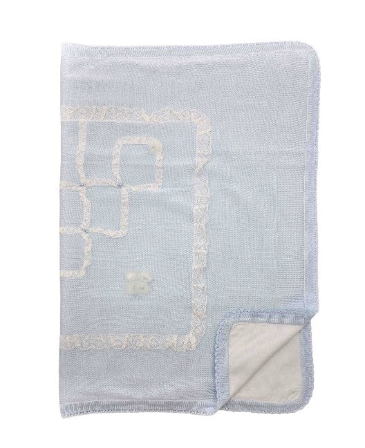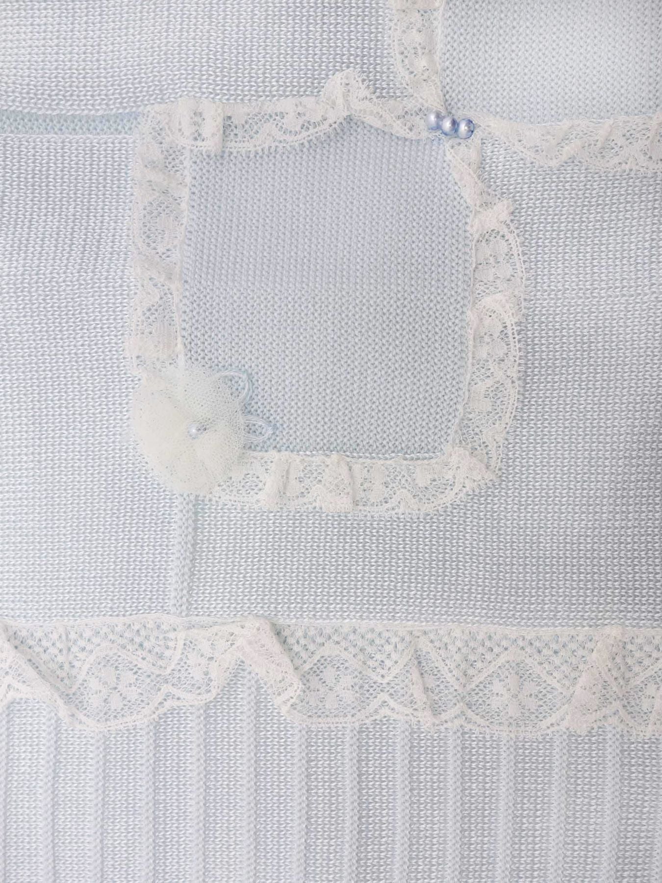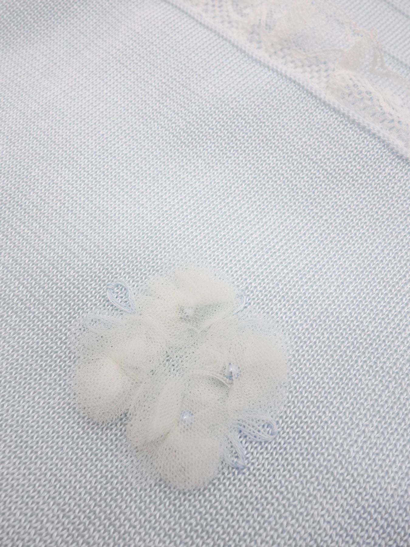 Copertina Creazioni Luana Neonato in filo celeste con fodera bianca. Applicazioni con pizzo valenciennes, fiori in velo e perline.