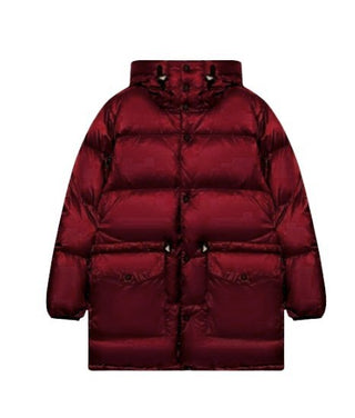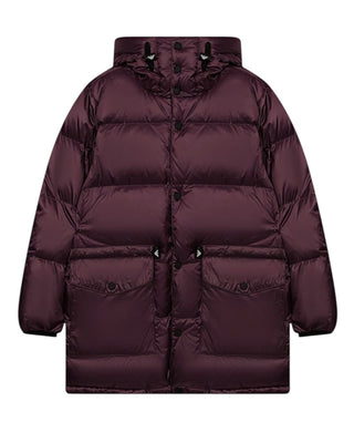 Giubbino imbottito bordeaux da bambino, realizzato in nylon semilucido. Presenta design trapuntato, cappuccio fisso con coulisse regolabile, chiusura frontale con zip e bottoni a pressione, maniche lunghe con polsini a coste, vita regolabile con coulisse e due tasche con patta applicate sul davanti.