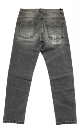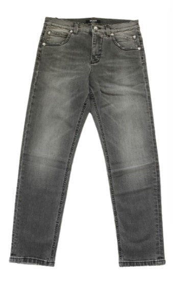Jeans modello cinque tasche. Chiusura frontale con bottone e zip. Stampa logo sul retro.