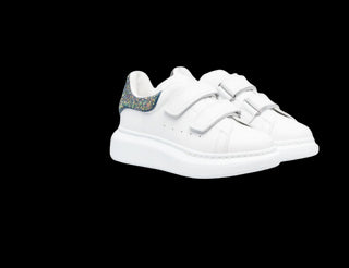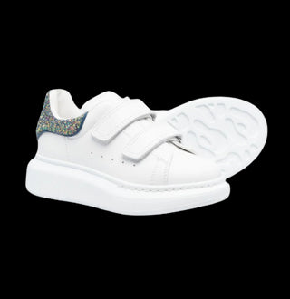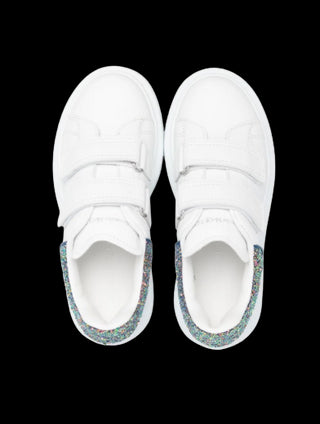 Sneakers low-top di Alexander McQueen Kids realizzata in pelle liscia color bianco con tallone glitterato e strappo.
