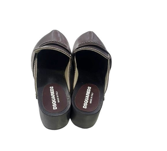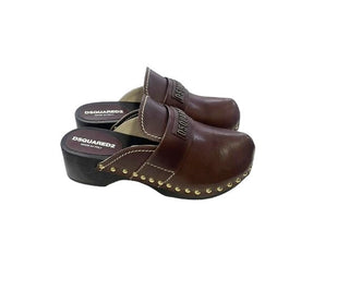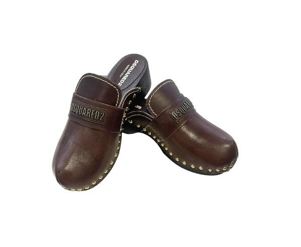 zoccolo in pelle con chiodino a contrasto e targhetta logo sul davanti