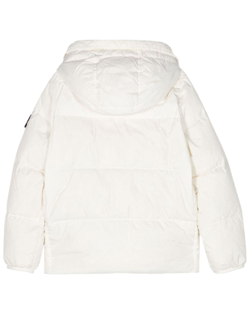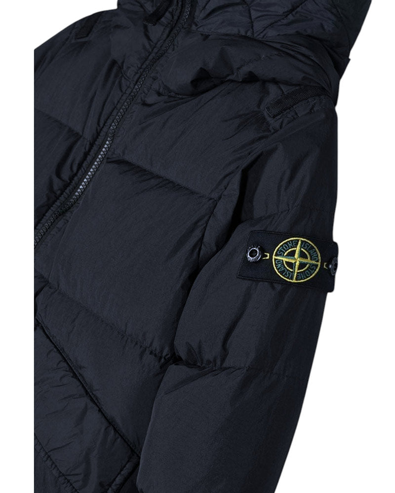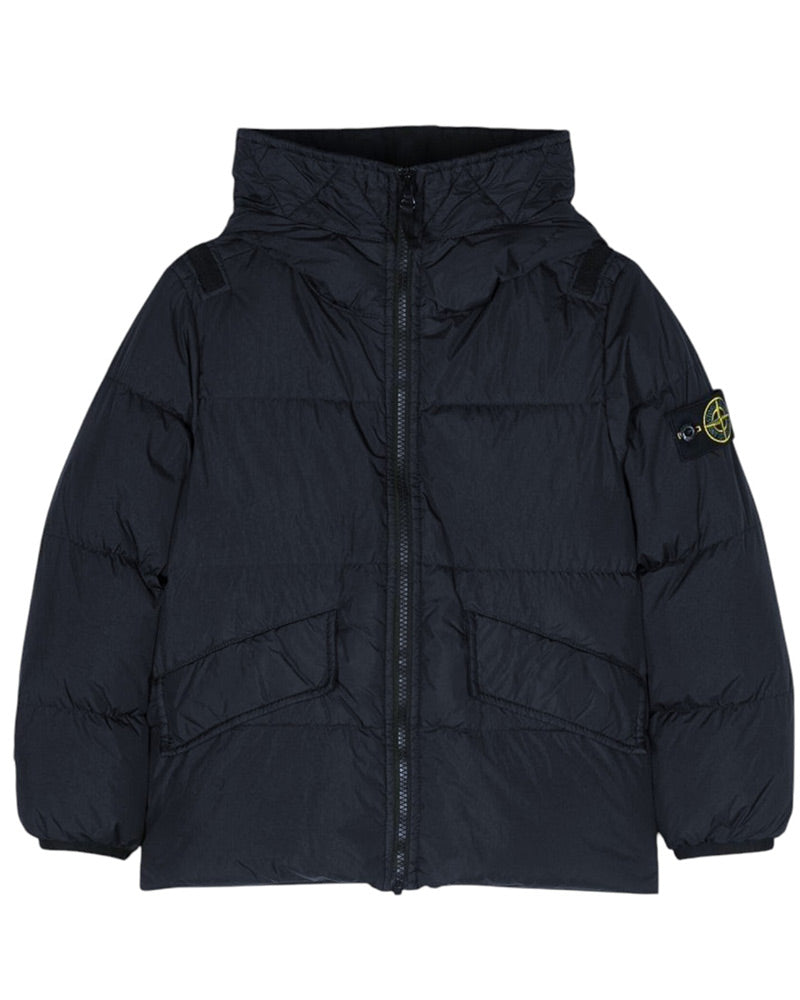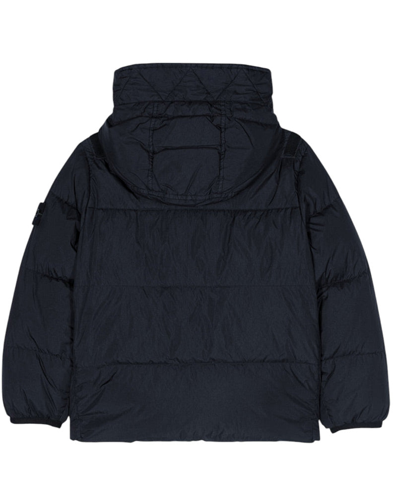 Giubbino imbottito da bambino, realizzato in poliammide. Presenta design trapuntato, collo alto, cappuccio fisso, chiusura frontale con zip, maniche lunghe con polsi elasticizzati e due tasche frontali con patta. È decorato con Badge Stone Island sulla manica sinistra.