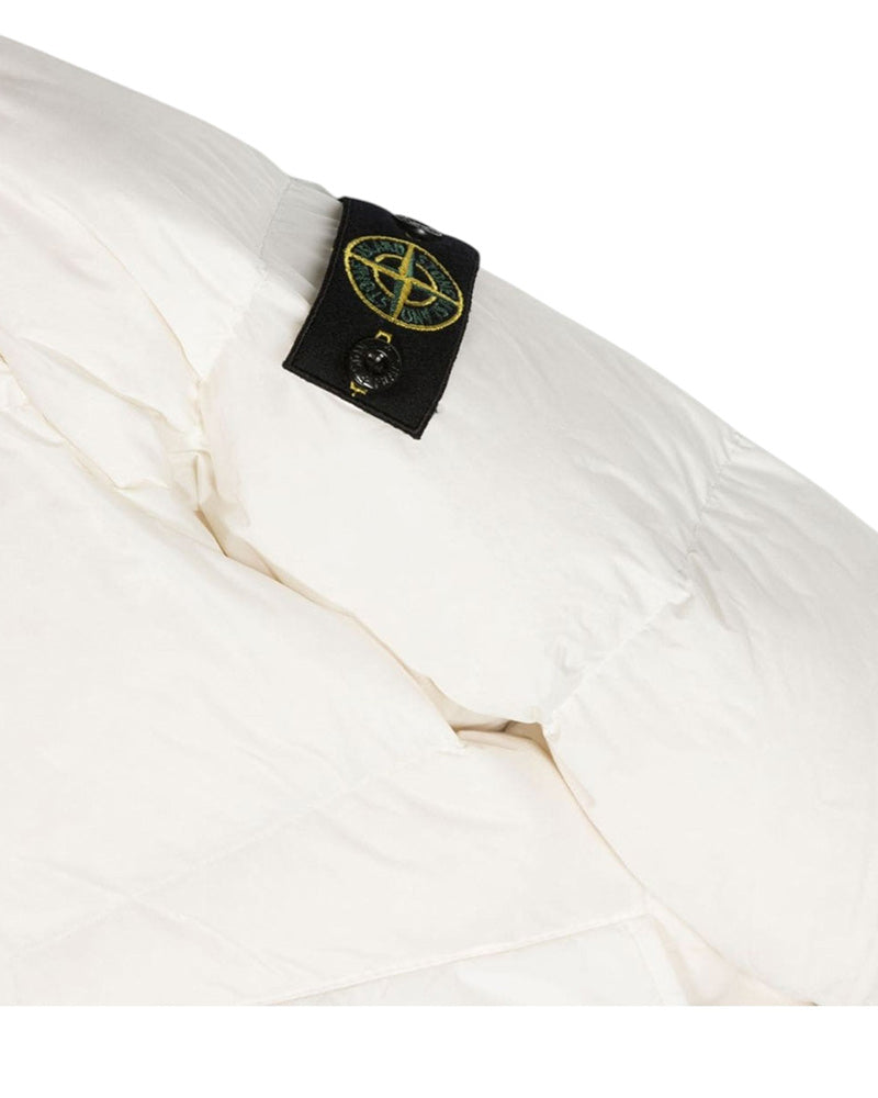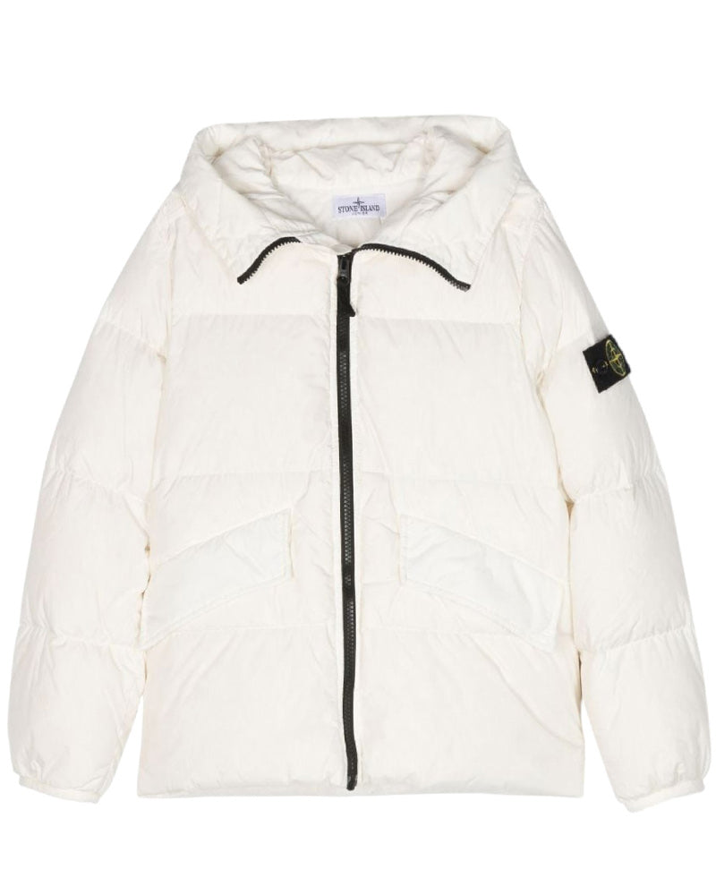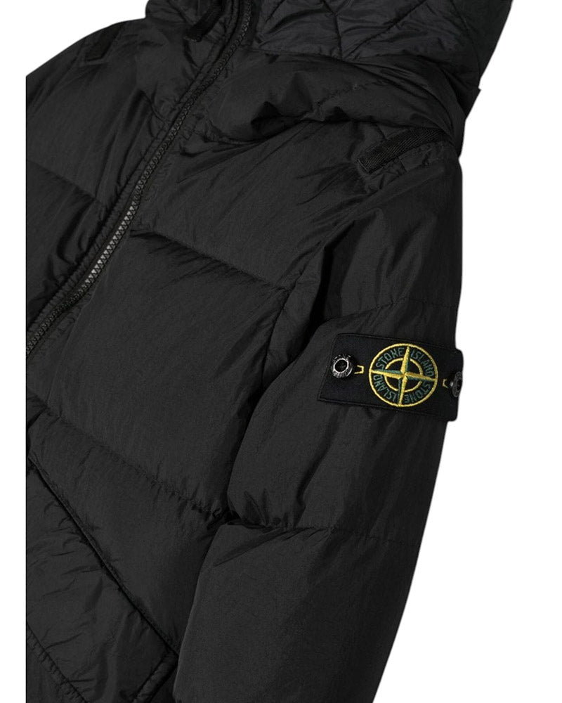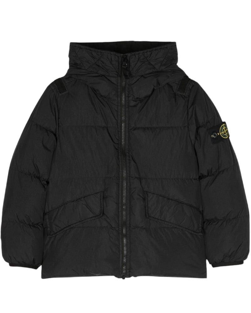 Giubbino imbottito da bambino, realizzato in poliammide. Presenta design trapuntato, collo alto, cappuccio fisso, chiusura frontale con zip, maniche lunghe con polsi elasticizzati e due tasche frontali con patta. È decorato con Badge Stone Island sulla manica sinistra.