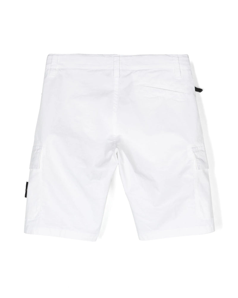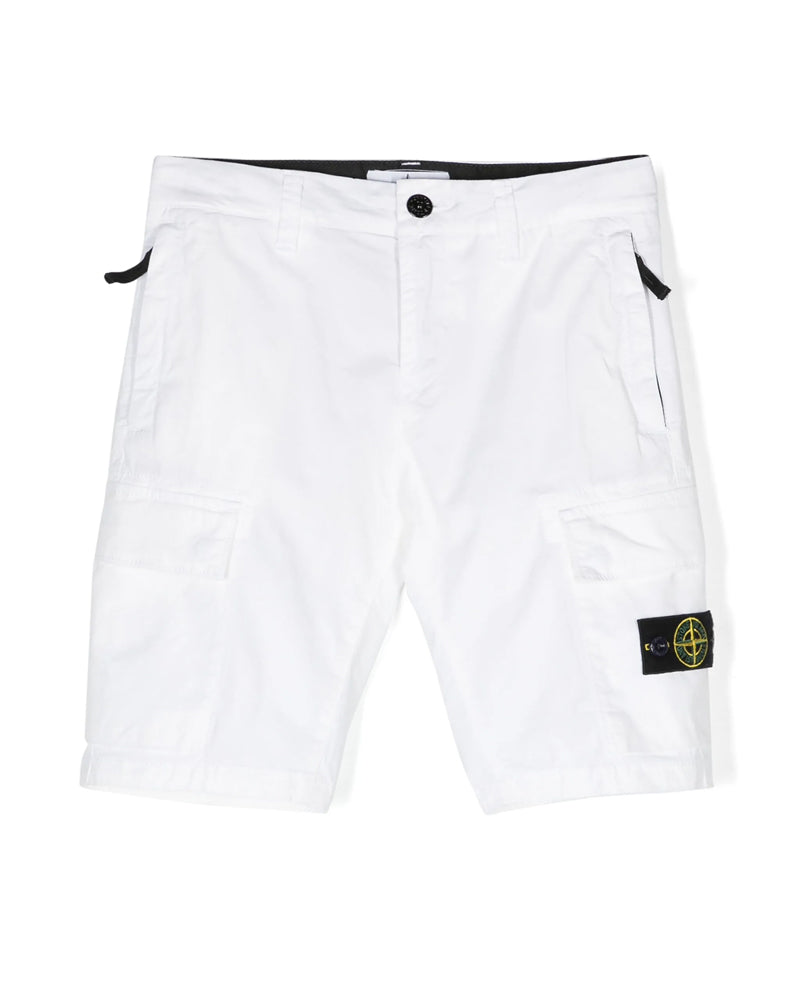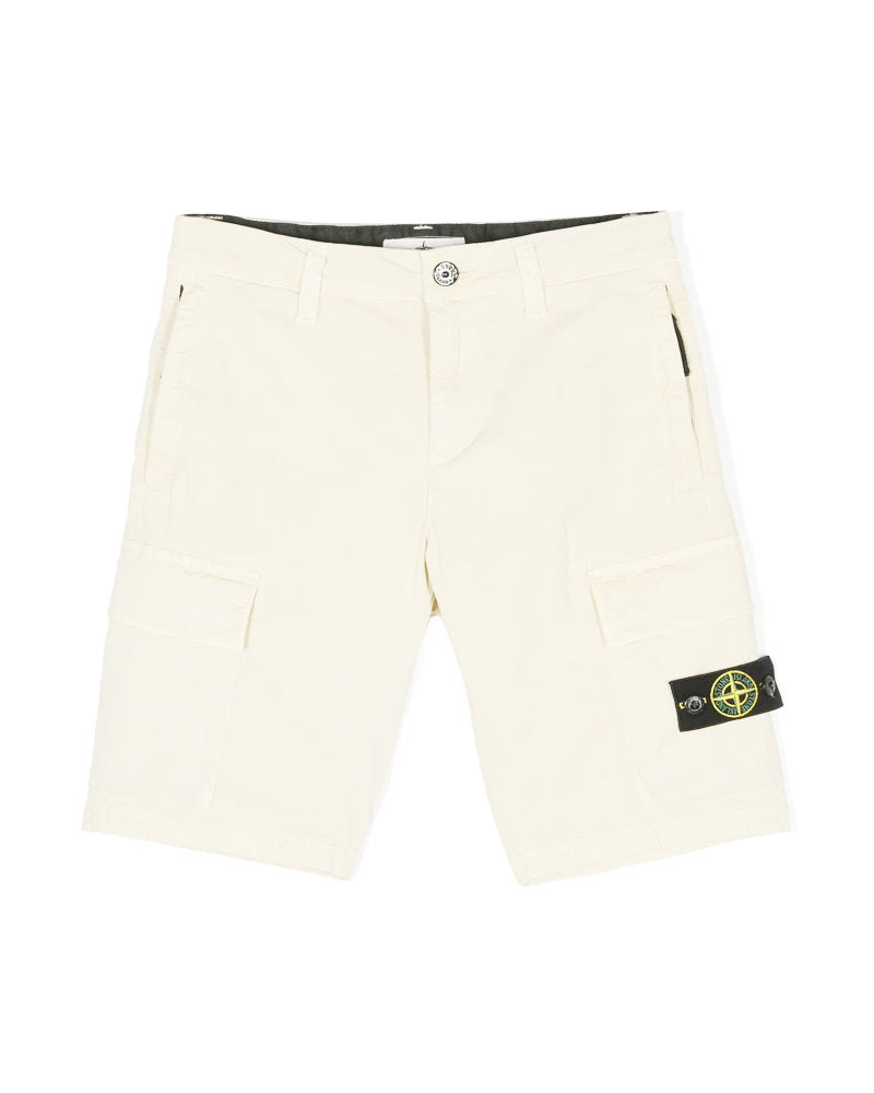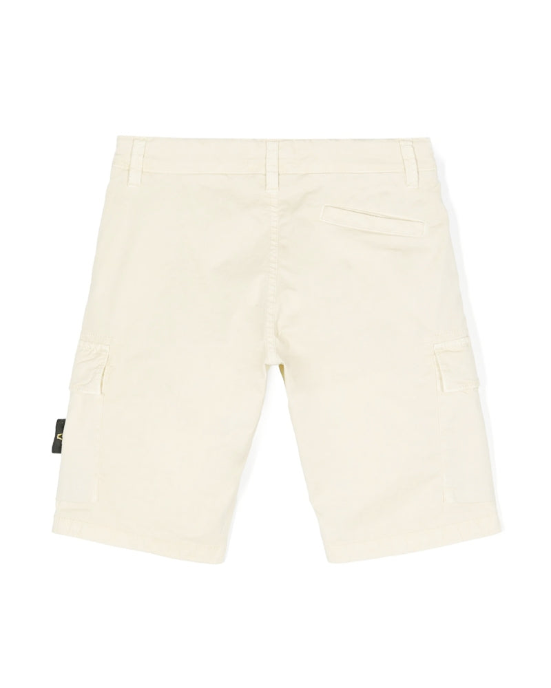Bermuda cargo in cotone elasticizzato, chiusura frontale con zip e bottone. Passanti per cintura. Due tasche laterali con zip, due tasche cargo frontali, tasca a filetto posteriore. Distintivo della bussola rimovibile sul lato.