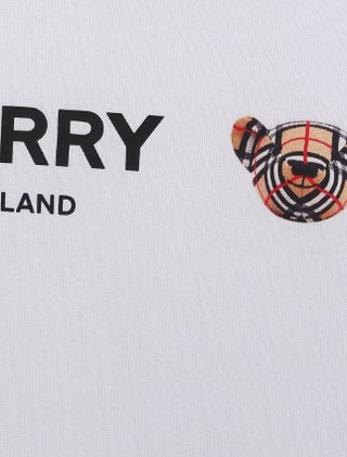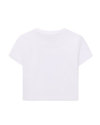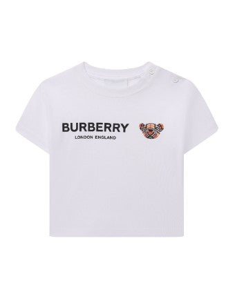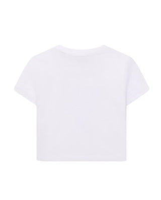T-shirt girocollo, manica corta, logo e simbolo stampato sul davanti. Chiusura con bottoni sulla spalla.