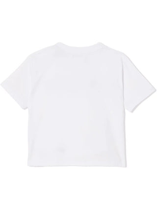 T-shirt girocollo, manica corta, logo ricamato sul davanti. Chiusura con bottoni sulla spalla.