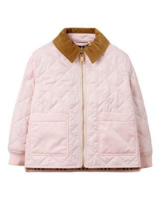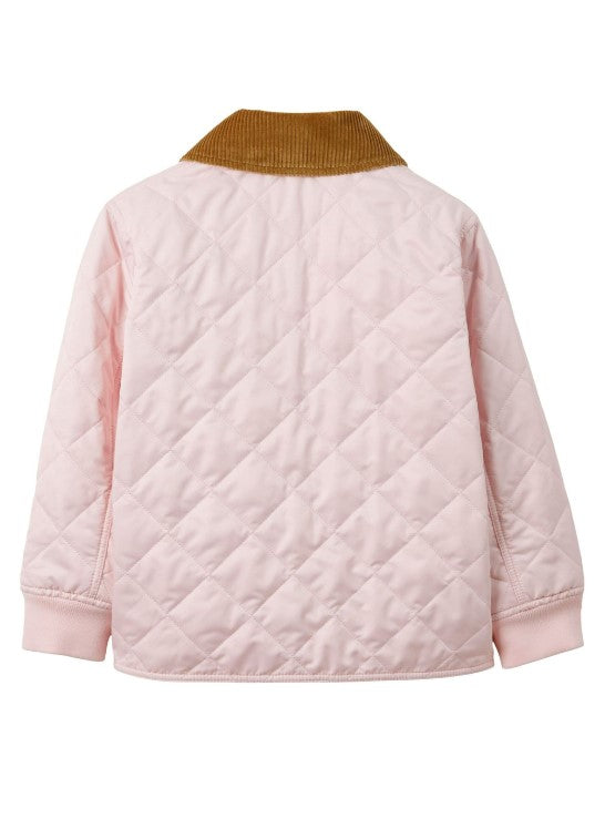 Giubbino bambina trapuntato, chiusura anteriore con zip, colletto e polsini a coste, due tasche applicate sul davanti.