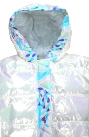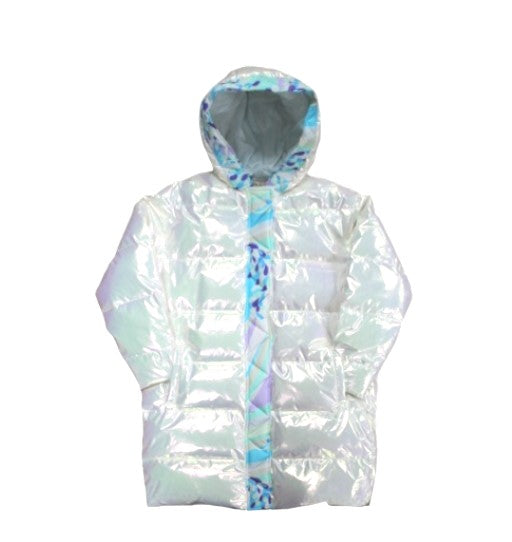 Giubbotto lungo, chiusura con zip e clips, cappuccio fisso, inserti in fantasia iconica.