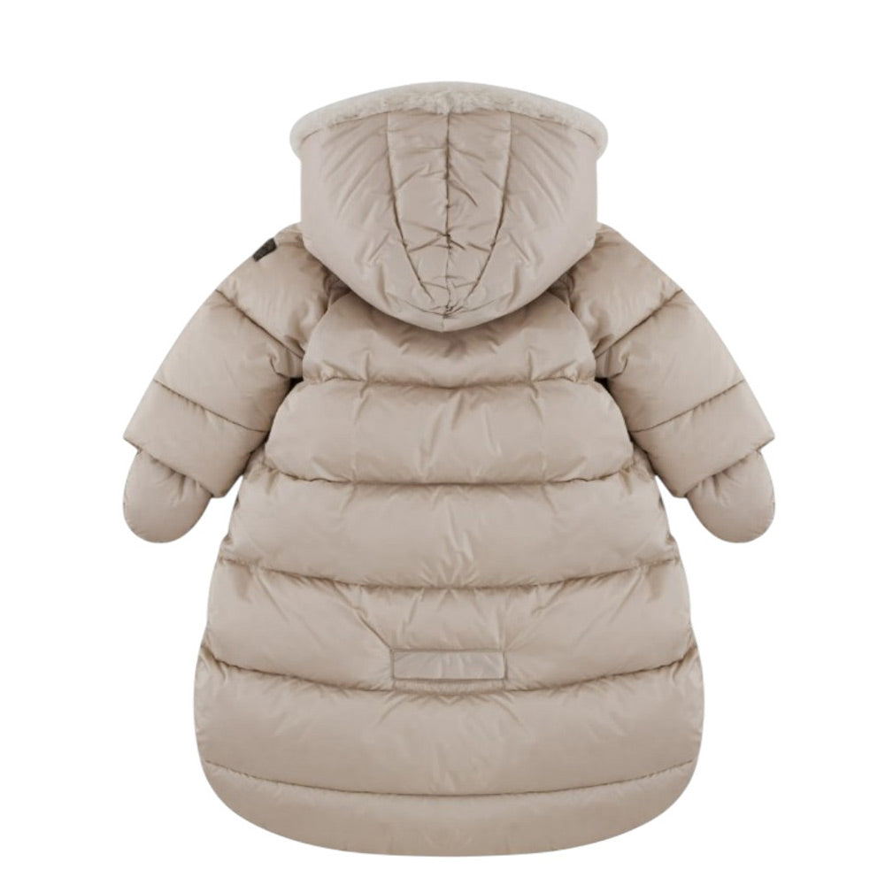 Sacco nascita realizzato in nylon, con imbottitura in piuma. Presenta design trapuntato, cappuccio fisso, fodera in morbido pile, chiusura frontale con zip, maniche lunghe con polsini elasticizzati. È decorato con patch logo applicata sulla manica.