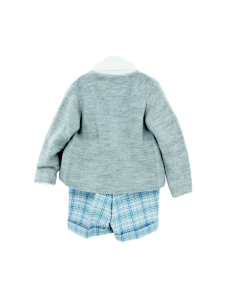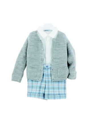 Completo A&J per neonati composto da camicia, pantaloncino a quadri con bretelle e cardigan con taschine. Realizzato con materiali di alta qualità per garantire comfort e stile. Perfetto per un look allegro e alla moda per il tuo piccolo.