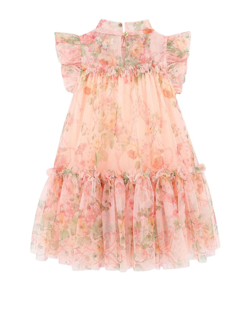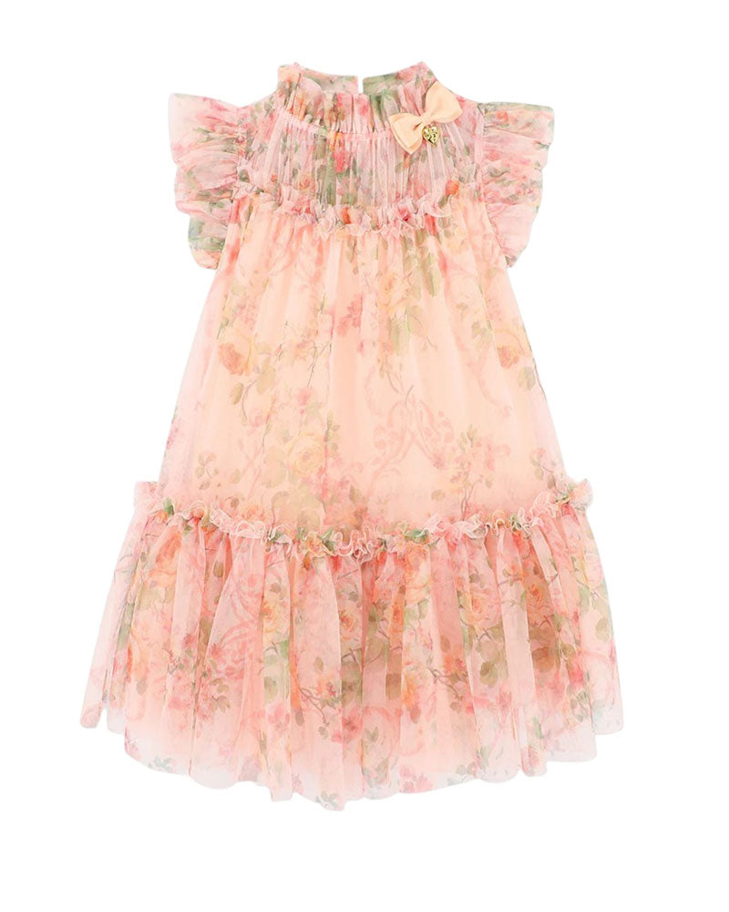 Abito in morbido tulle in fantasia floreale, collo e maniche con ruches, balza all'orlo, chiusura con bottone sul retro, fiocco e dettaglio in metallo oro applicato sulla spalla.