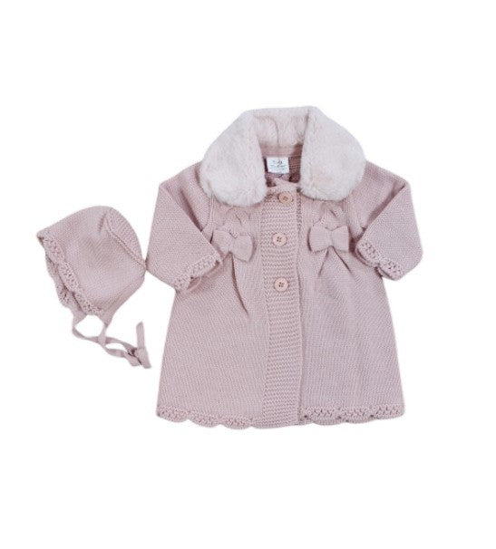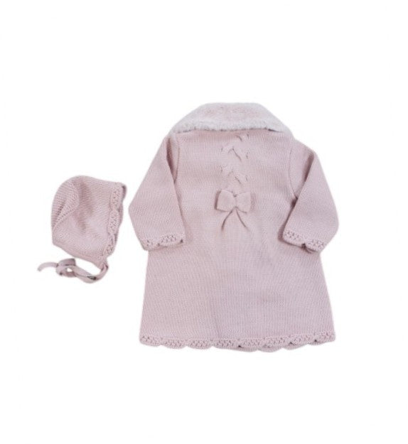 cappottino in misto lana con fiocchetti sul lato e collo in pelliccetta ecologica completo di cuffia