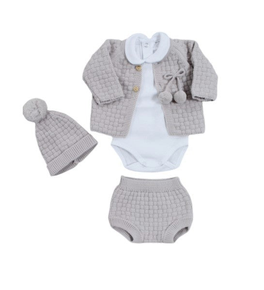 completo 2 pezzi misto lana con body colletto tondo pantaloncini a culotta giacchina con bottoni finto legno fiocchetto con pon pon sul lato completo di cappellino