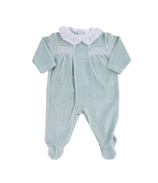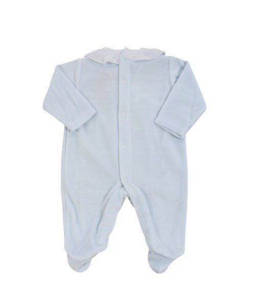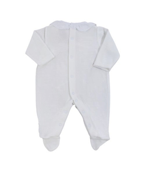 tutina in ciniglia con ricamo e bottoncini sul davanti colletto con rouches in cotone