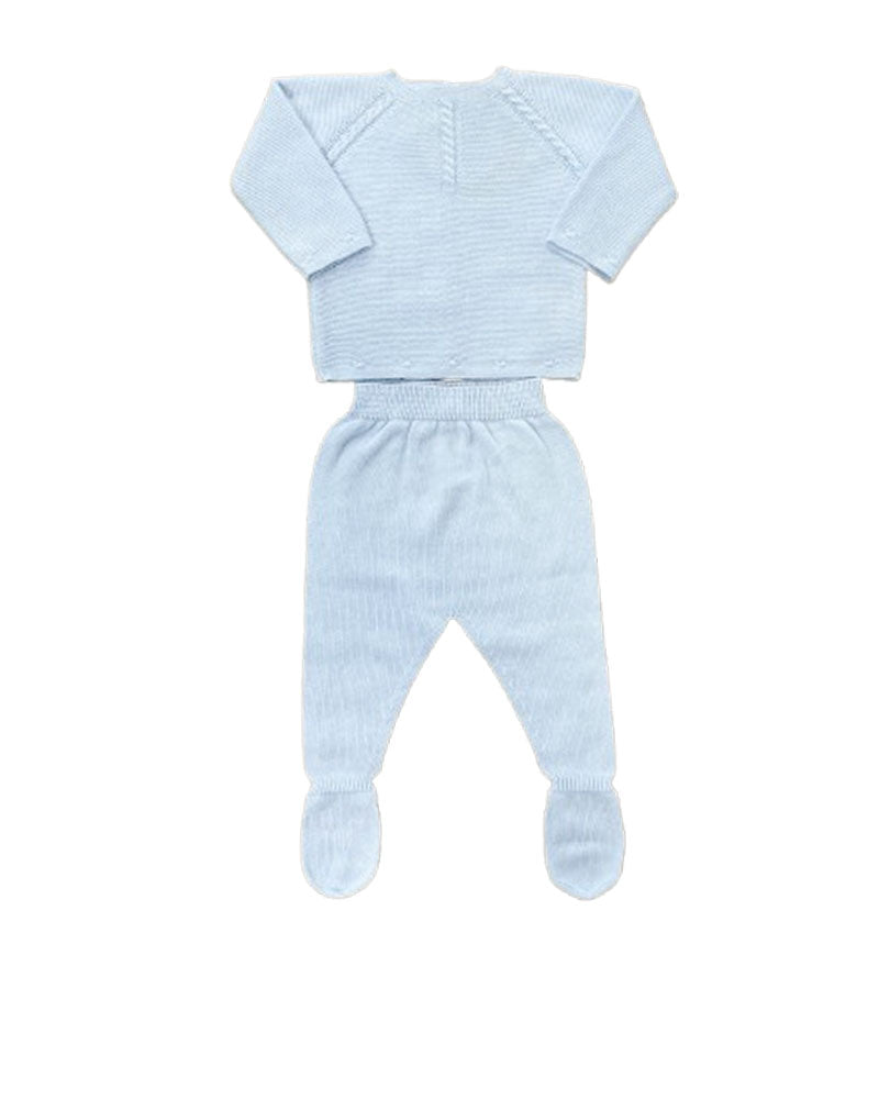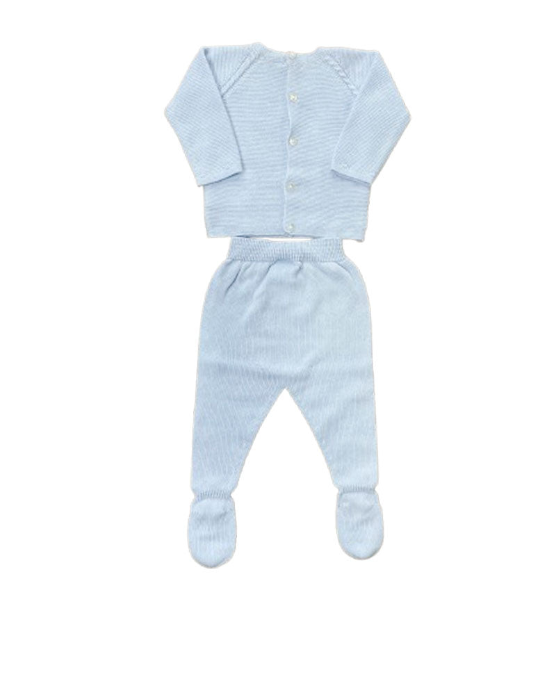 Tutina 2 pezzi in filo manica lunga treccine sulla spalla e bordini con nodini pantaloncino a ghetta con piedini
