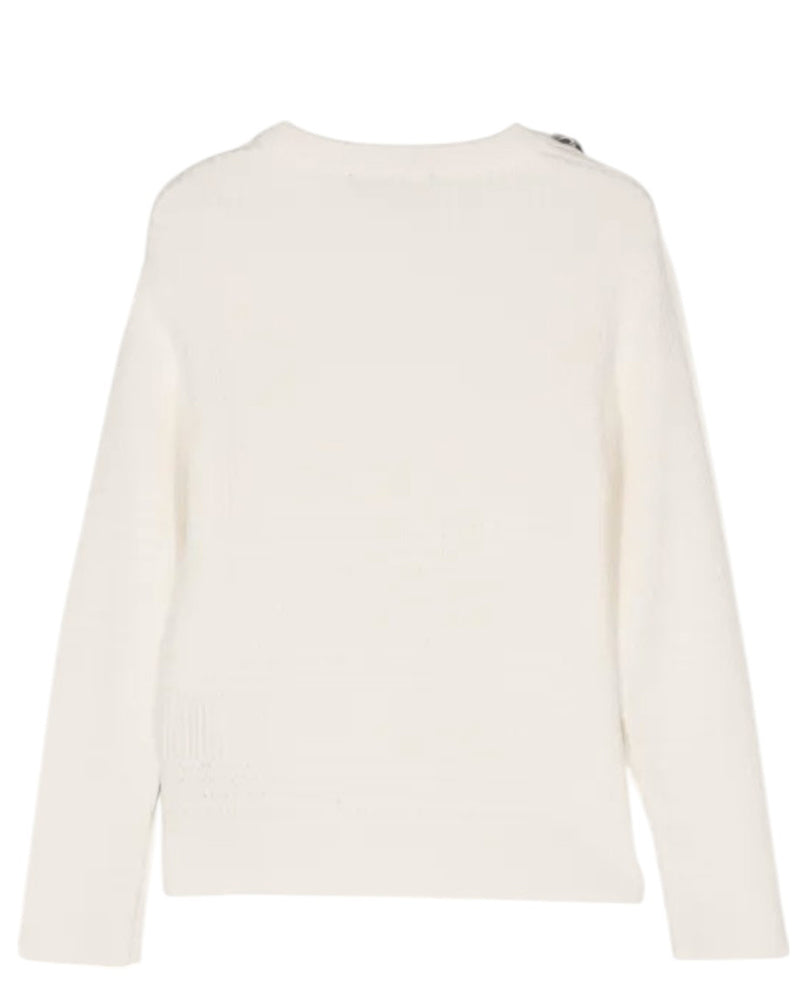 Maglia avorio da bambina realizzata in lana vergine. Presenta design a coste con dettagli traforati, collo tondo, maniche lunghe e finiture a costine. È decorata con bottoni logati sulle spalle e logo ad intarsio sulla parte anteriore.