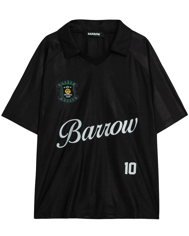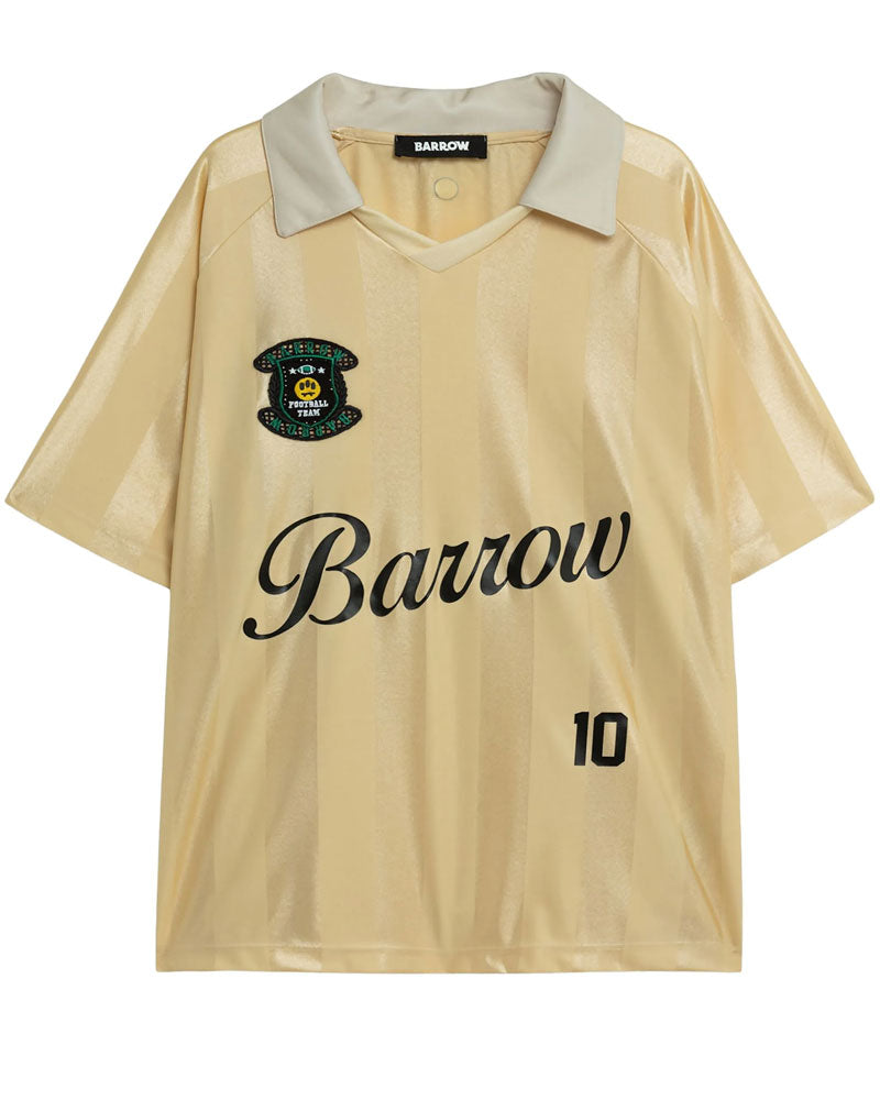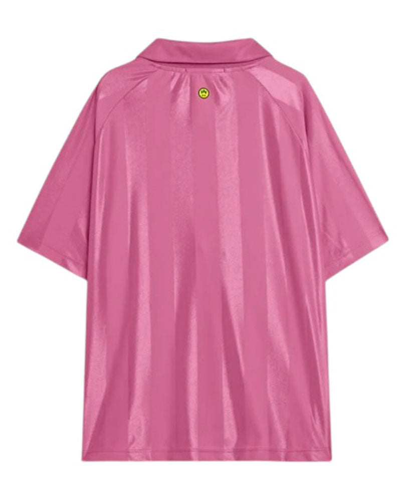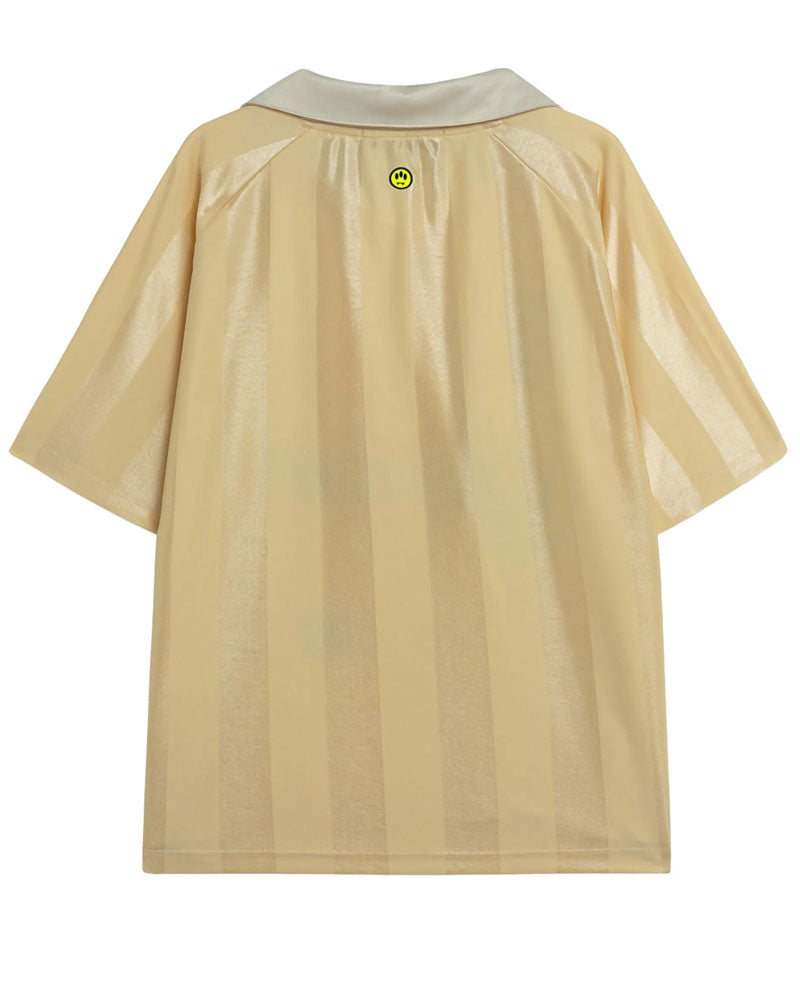 T-shirtcon scollo a V, maniche corte in triacetato a righe tono su tono, patch e stampa Barrow sul fronte e smile sul retro.