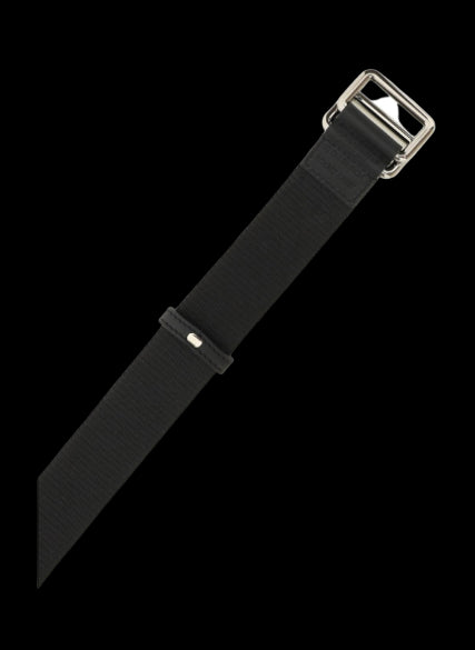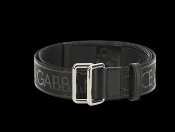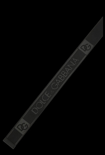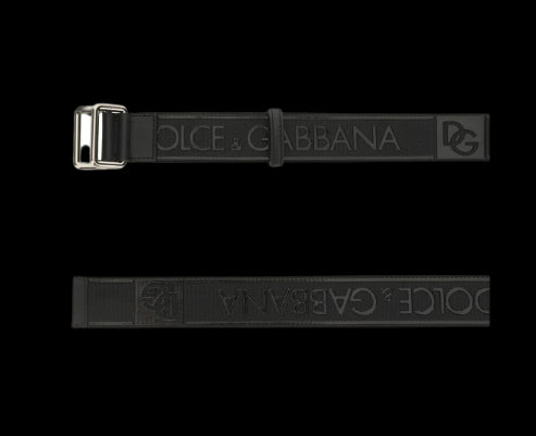 Cintura Dolce & Gabbana in tessuto tecnico con il logo gommato a contrasto applicato in rilievo su tutta la lunghezza. Dettagli in pelle, doppia fibbia scorrevole in metallo brunito con il logo inciso.