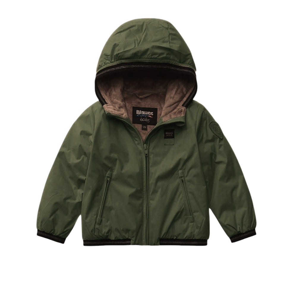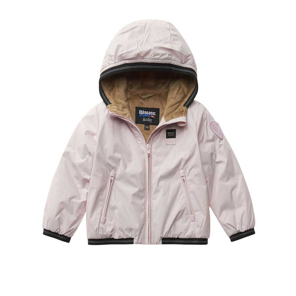 Giubbino imbottito Edith di Blauer Kids realizzato in nylon, caratterizzato da fodera in marmotta, cappuccio fisso, chiusura frontale con zip, maniche lunghe, due tasche laterali all'americana con zip e finiture elasticizzate. È decorato con patch logo applicata sul petto e sulla manica.