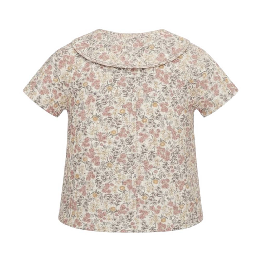 Camicia con fantasia floreale per bambina, realizzata in popeline di cotone. Presenta colletto stondato, chiusura frontale con bottoni, maniche corte e orlo dritto.